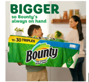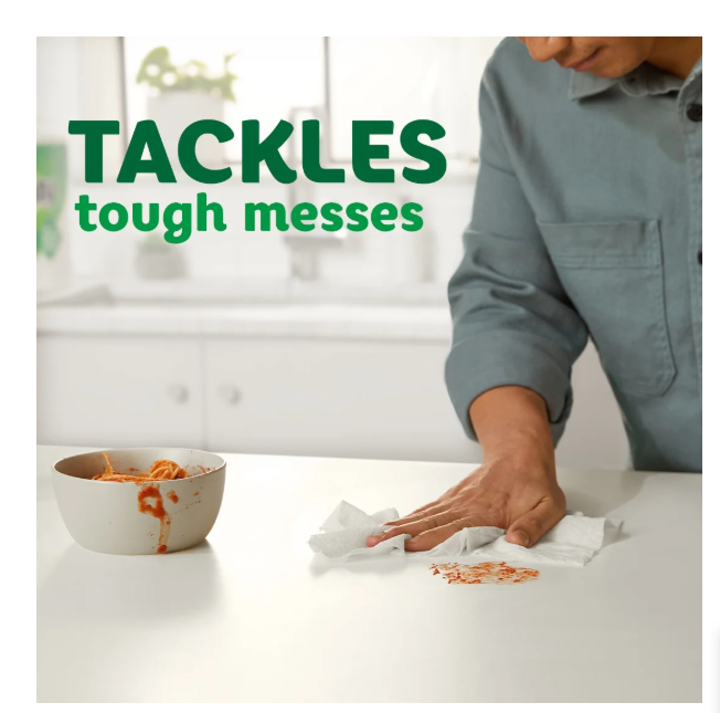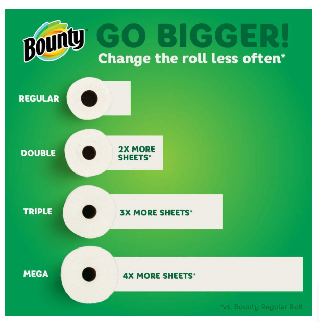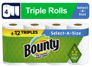 Be ready to tackle messes and spills with Bounty Paper Towels Select-A-Size 4 Triple Rolls. Each sheet of Bounty paper towels is 2x more absorbent, so you can use less and pick up spills and messes quicker than the leading ordinary towel brand. Bounty paper towels Select-A-Size sheets are versatile, so you can choose your sheet size depending on your mess. Bounty Triple Rolls have more paper towel sheets on each roll (vs. a Bounty double roll), so you run out less often. And if you’re buying bigger packs, you’ll always have Bounty on hand. Bounty paper towels have your back in and out of the kitchen. Whether it’s juice on the counter or ice cream on the table, Bounty paper towels make sure no mess will mess with you.