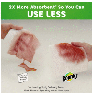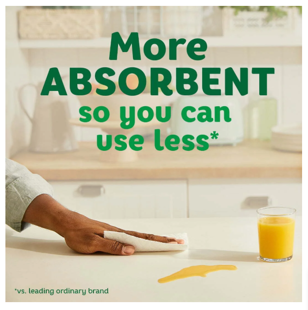Bounty Paper Towels are more absorbent so you can use less vs. leading ordinary towel brand