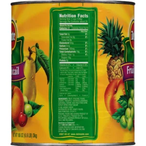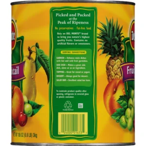 The Del Monte Fruit Cocktail in Light Syrup picks and packs its fruit at the peak of ripeness. This food product comes in a large, 106-oz can. Del Monte strives to provide high-quality and reliable canned fruit products. This fruit contains no artificial sweeteners or flavors. It is also fat-free and does not contain preservatives. This can of fruit can be utilized in many different ways, such as a garnish for the main course, a side dish or part of a salad. The Dole fruit cocktail can also be used as a topping over yogurt or can be paired with a dessert such as ice cream.