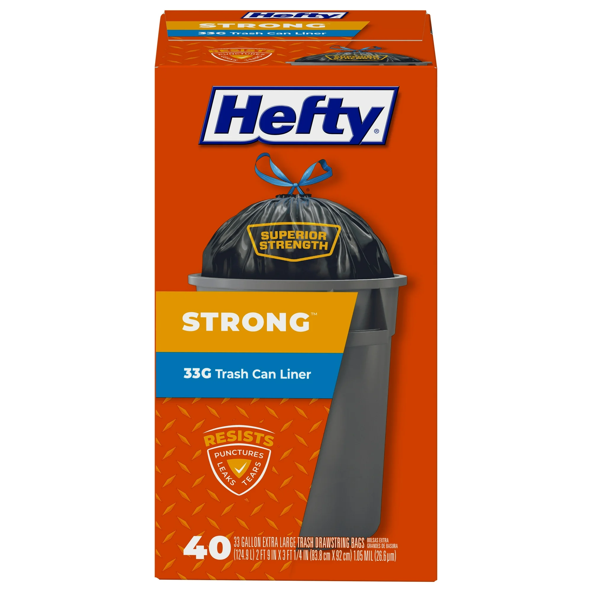 - This package contains 40 Hefty Strong, extra large, black, unscented, 33 gallon trash bags, each 1.05 mil thick
