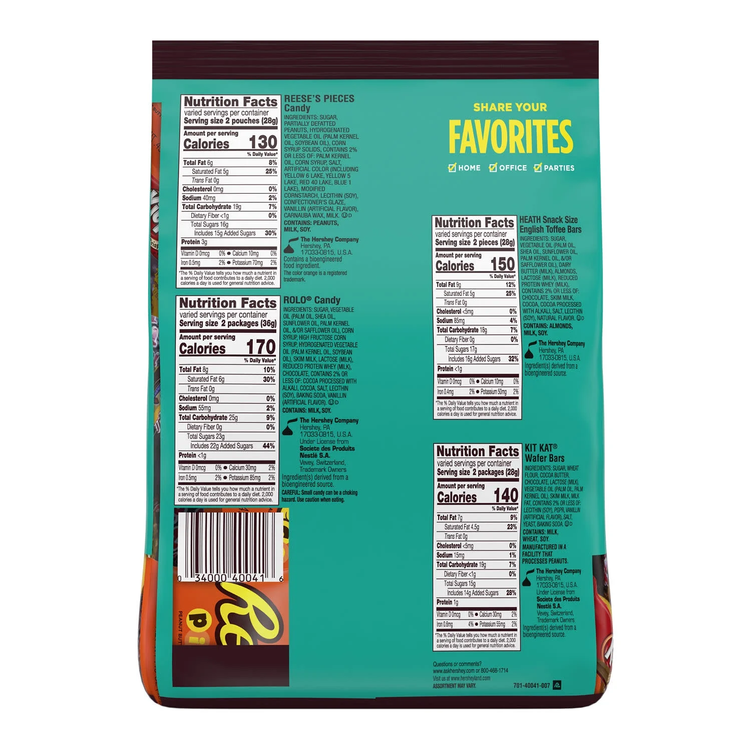 Enjoy a delicious candy treat anywhere and anytime with Hershey snack size assorted candy, perfect for snacking, parties, holidays and more. Offering five crowd-pleasing favorites, this chocolate candy variety pack is perfect for sharing with family, friends, teammates or co-workers. Take this bulk candy bag into the office break room, pour some individually wrapped candies into your jar at home or take a box to your next sports game to celebrate the win. This assorted bag of snack size candy contains HEATH chocolatey English toffee bars, REESE’S PIECES peanut butter candy, MILK DUDS chocolate and caramel candy, KIT KAT milk chocolate wafer bars and ROLO rich chocolate caramel candy.