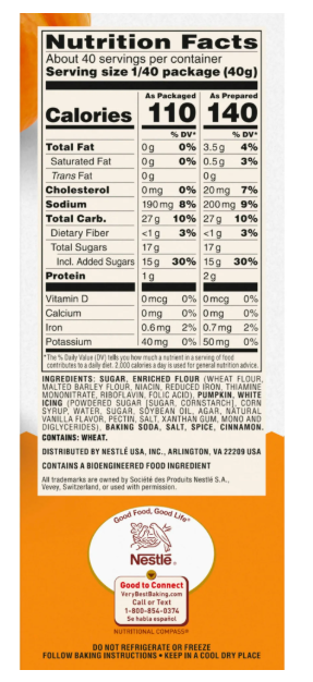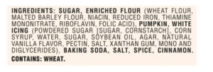 SUGAR, ENRICHED FLOUR (WHEAT FLOUR, MALTED BARLEY FLOUR, NIACIN, REDUCED IRON, THIAMINE MONONITRATE, RIBOFLAVIN, FOLIC ACID), LIBBY’S® PUMPKIN, WHITE ICING (POWDERED SUGAR [SUGAR, CORNSTARCH], CORN SYRUP, WATER, SUGAR, SOYBEAN OIL, AGAR, NATURAL VANILLA FLAVOR, PECTIN, SALT, XANTHAN GUM, MONO AND DIGLYCERIDES), 2% OR LESS OF SPICES, BAKING SODA, SALT.